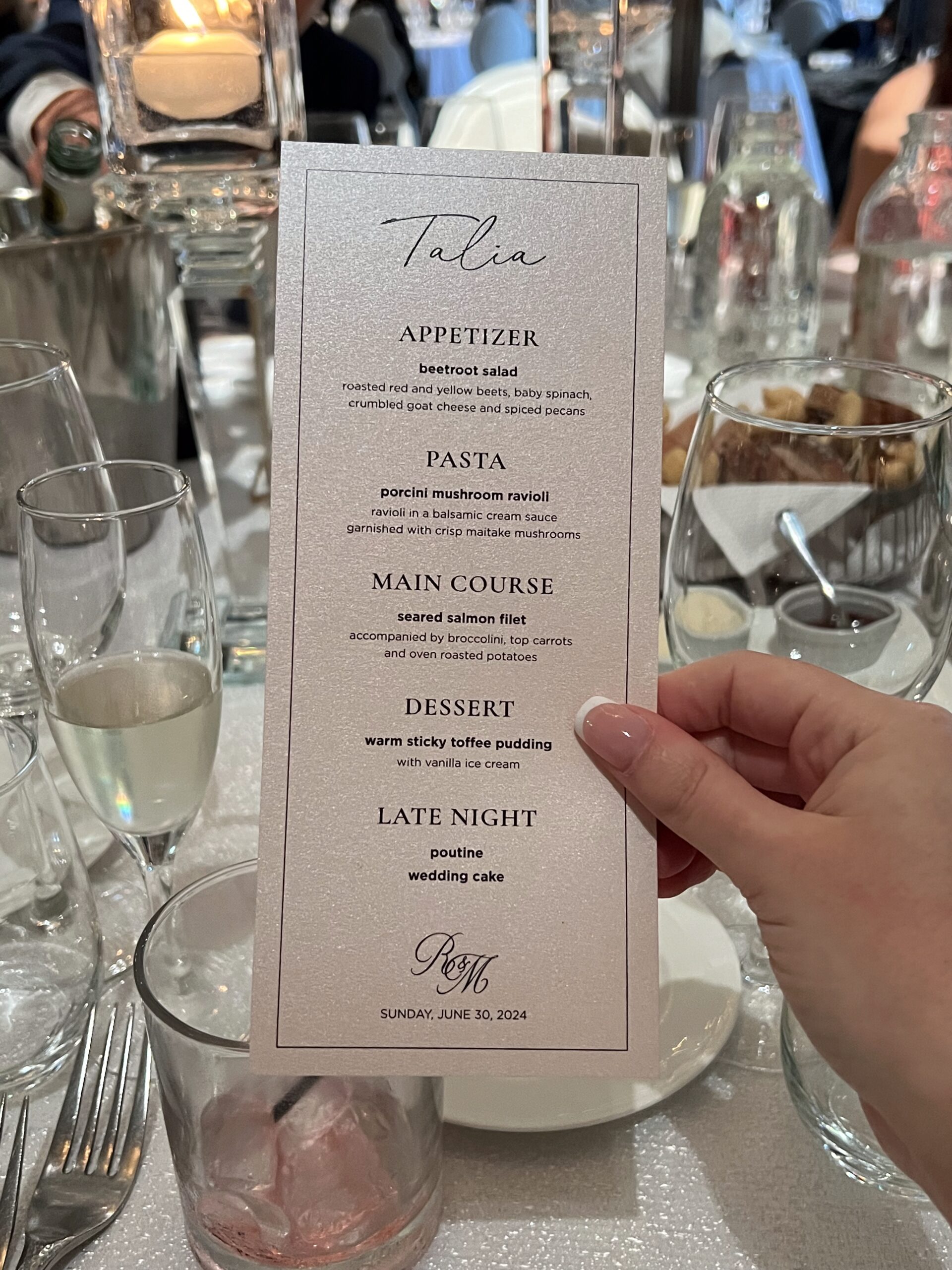 For this modern wedding at an Italian restaurant, the couple wanted a visual identity that reflected their personalities and played off the groom’s last name, Fishman. I designed a custom logo featuring two fish intertwined to represent the couple and extended the design across all day-of pieces. Inspired by the restaurant’s vibrant colors, we balanced playful Italian flair with sophistication, using rich colours, and tasteful accents, avoiding anything overly feminine or theme-heavy. The result was a fresh, personal, and stylish celebration.